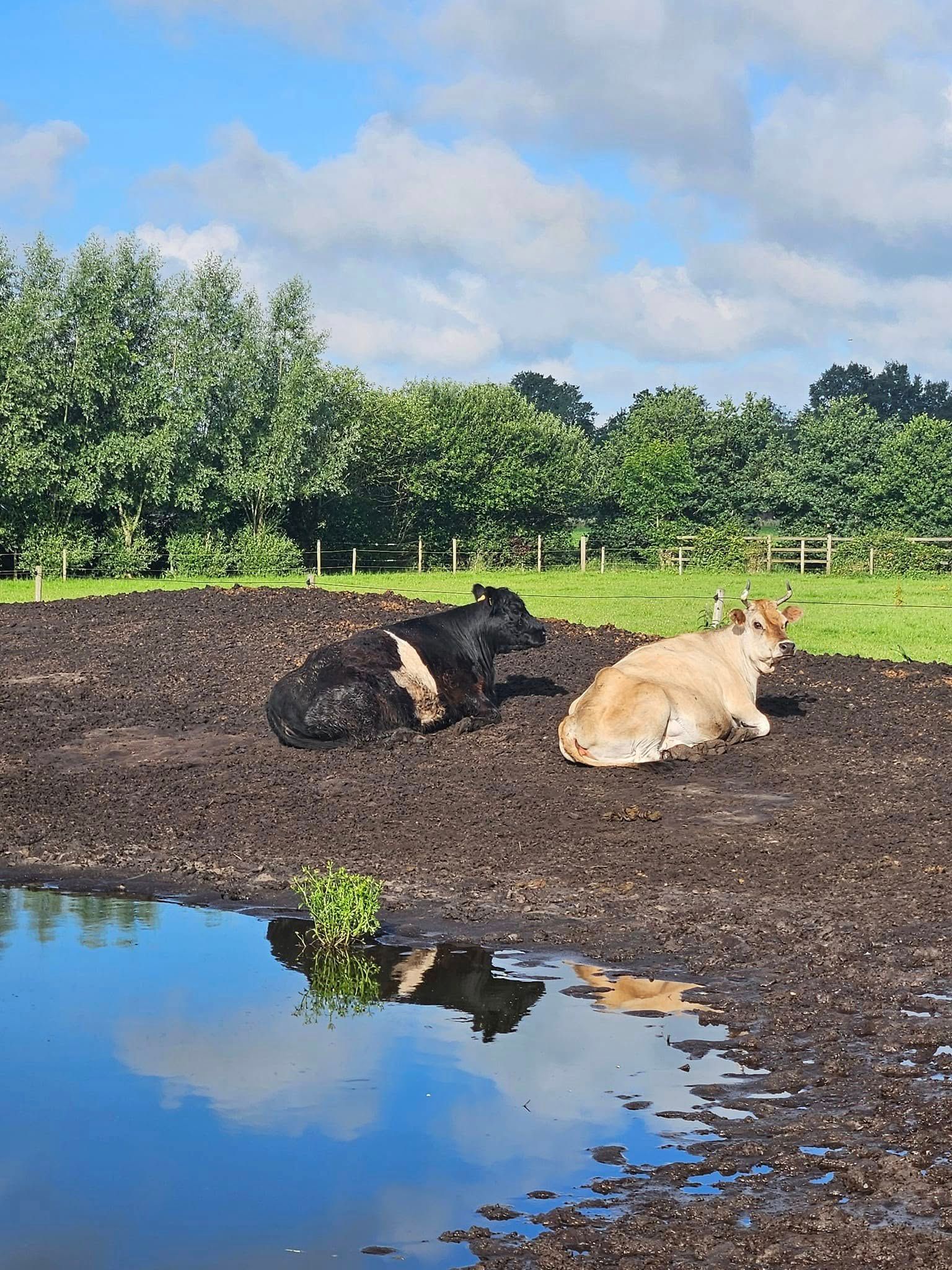 In totaal hebben we 2 koeien op de boerderij. Deze lopen in het weiland tussen de paarden en pony's, en in de winter staan ze in hun eigen stal.