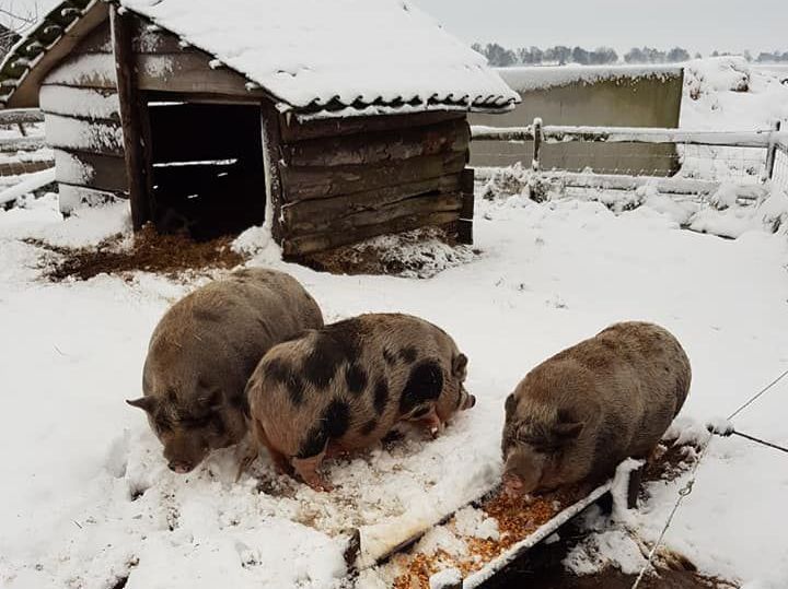 Midden op de boerderij staat de varkensweide. Hier lopen de varkens samen met twee geiten. Ze hebben een eigen modderpoel en schuilstal ze kunnen slapen. Naast het varkensvoer, genieten ze ook van schillen en andere etensresten van onze bewoners.